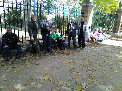 A pesar de ser 58 senderistas formamos un grupo compacto y a la voz de cuando comemos ...... paramos al final del vallado de los jardines, todos sentaditos a la sombra de los grandes guardianes del paseo.